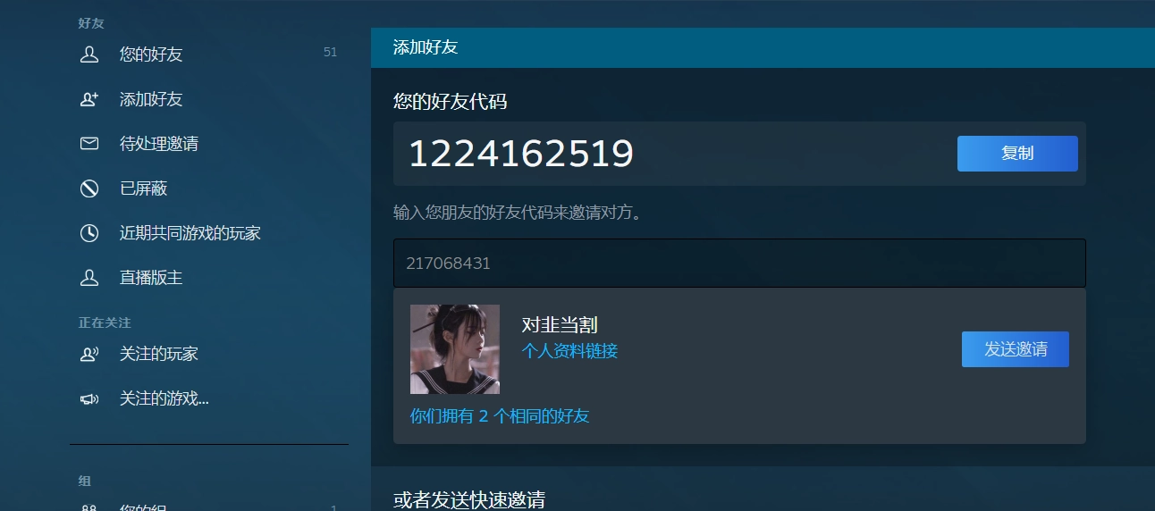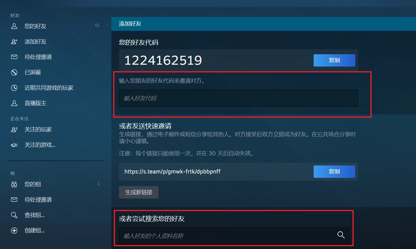 输入好友代码或者steam名称来搜索好友然后添加