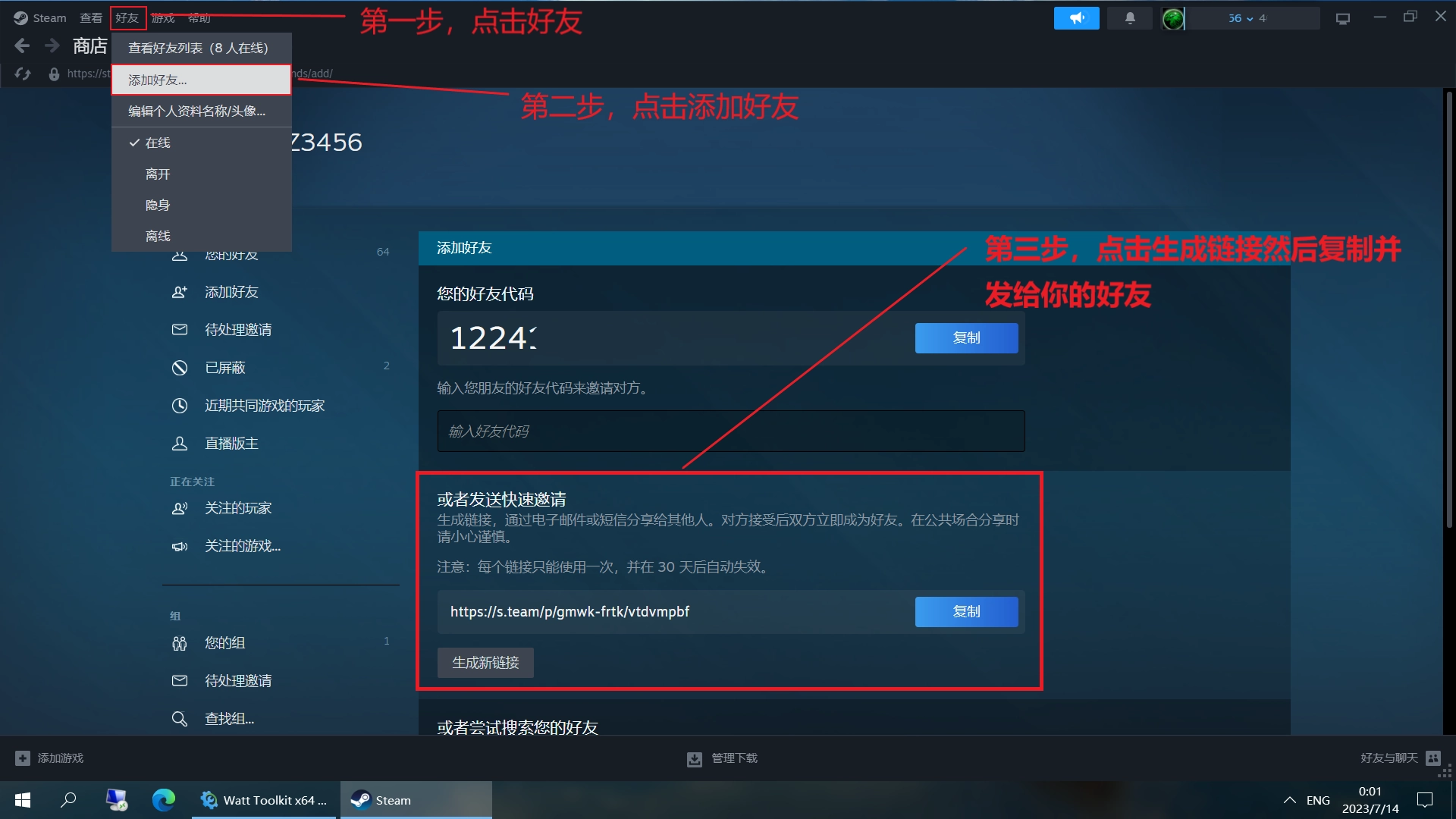 左上角点击好友-添加好友-生成链接并复制
