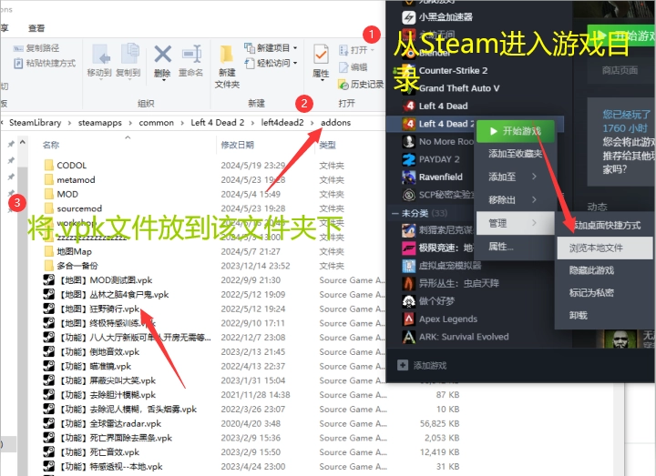 找到你的游戏目录然后把后缀为.vpk的文件放到addons文件夹即可