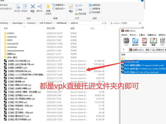 若你下载的是.vpk文件可以直接放到addons(地图5.24.7z)