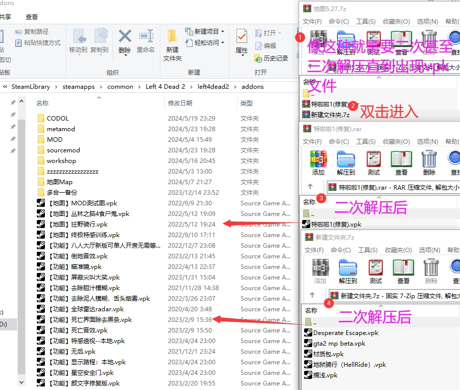 如果你下载的是压缩包(如图)则需要先打开压缩包并解压。你需要有一个解压缩工具以WinRAR为例,其他的都差不多。找到vpk文件把它托到游戏的addons文件夹内即可完成安装