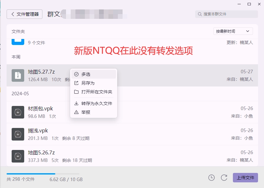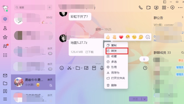 注:新版NTQQ只能在聊天框现场转发,而不能在群文件里面转发!