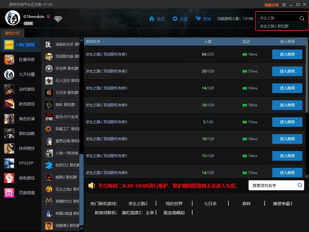 安装游侠→搜索求生之路2→加入一个人少延迟低的房间