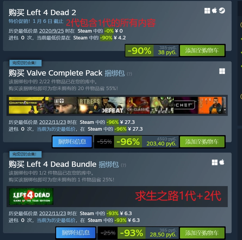 求生之路2只需要购买本体就行(2代包含1代的所有内容,1.2代组合包打折更划算)